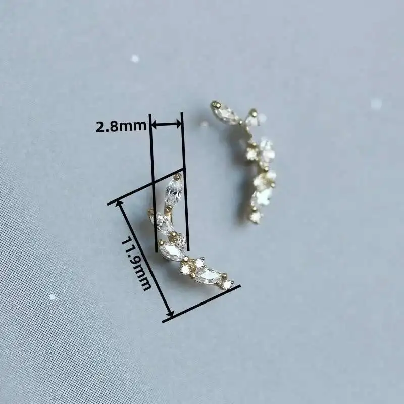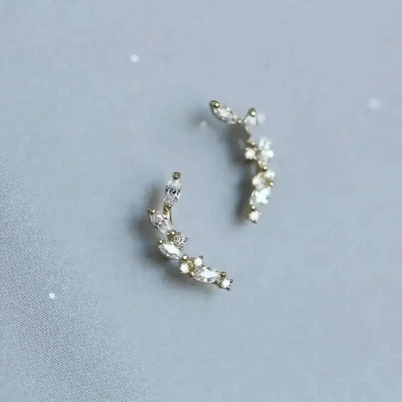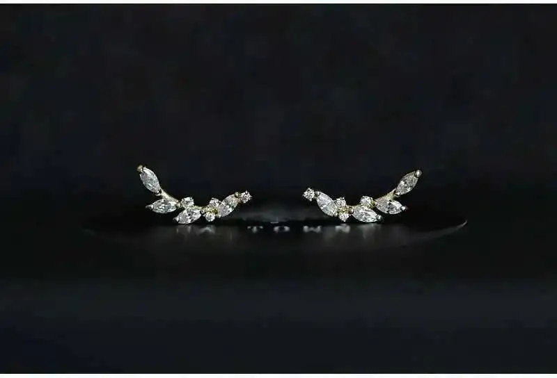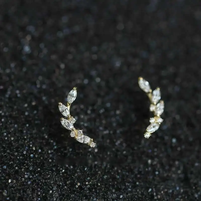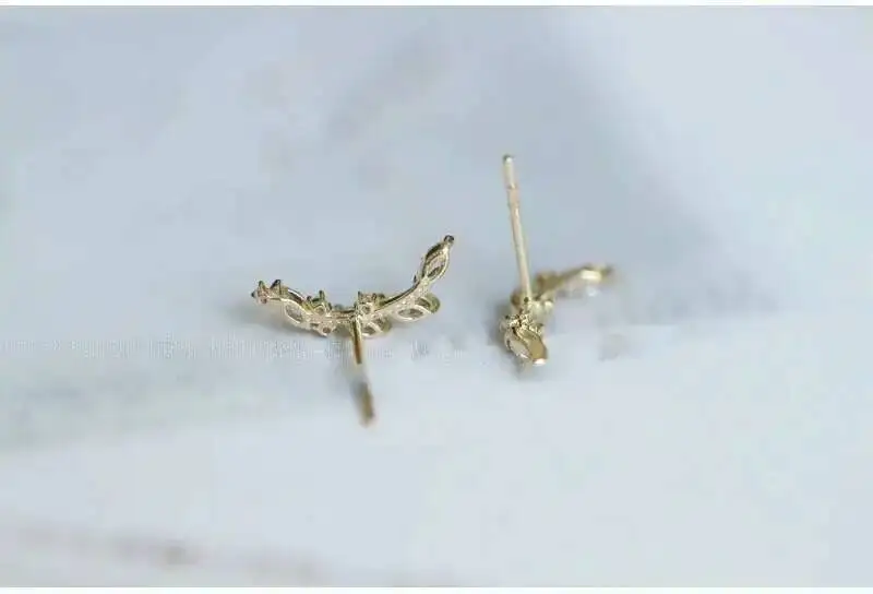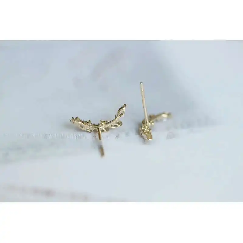 14K Pure Gold Inlaid Zircon Ear Studs for Women, Super Flash, Arc, Laurel Branch, kj236