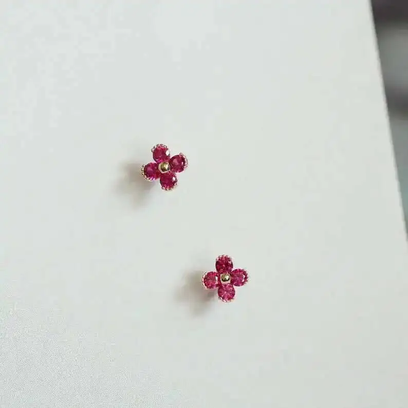 9k Solid Gold Crystal Stud Earrings, Unique Flower, Pink, Cute, Korean Style, Women, Kids, Girls, New Arrival, kj252