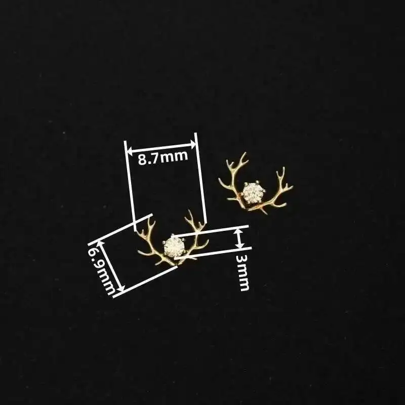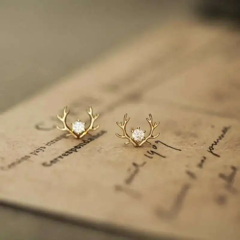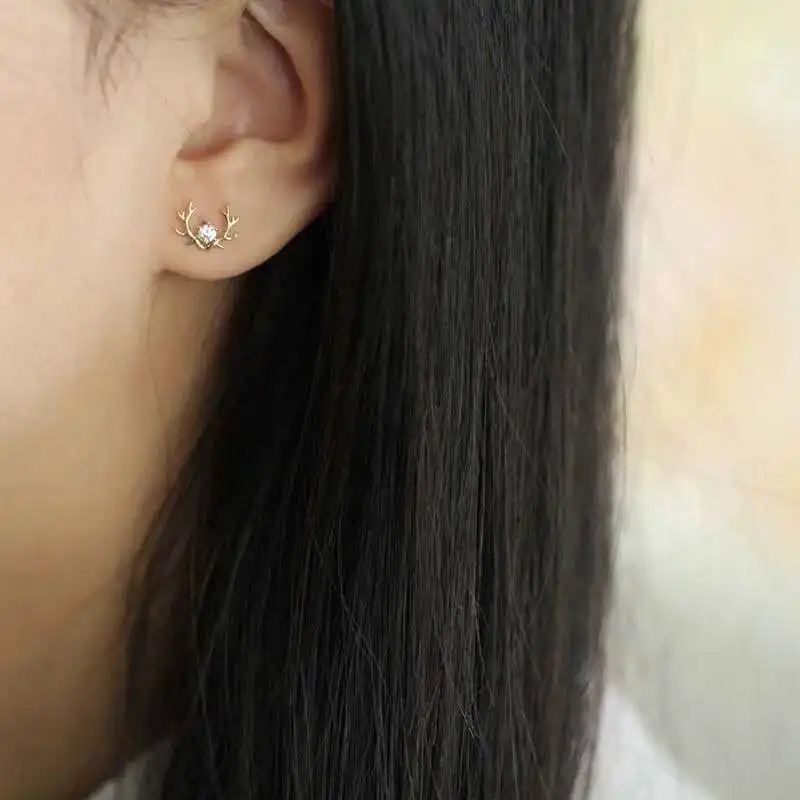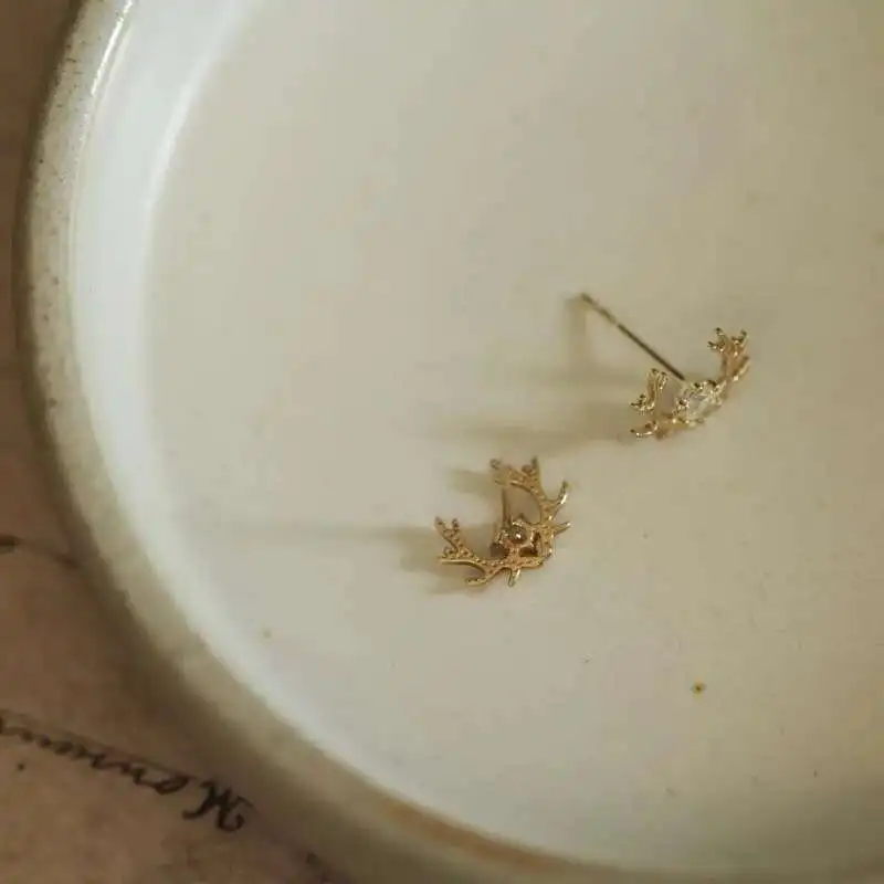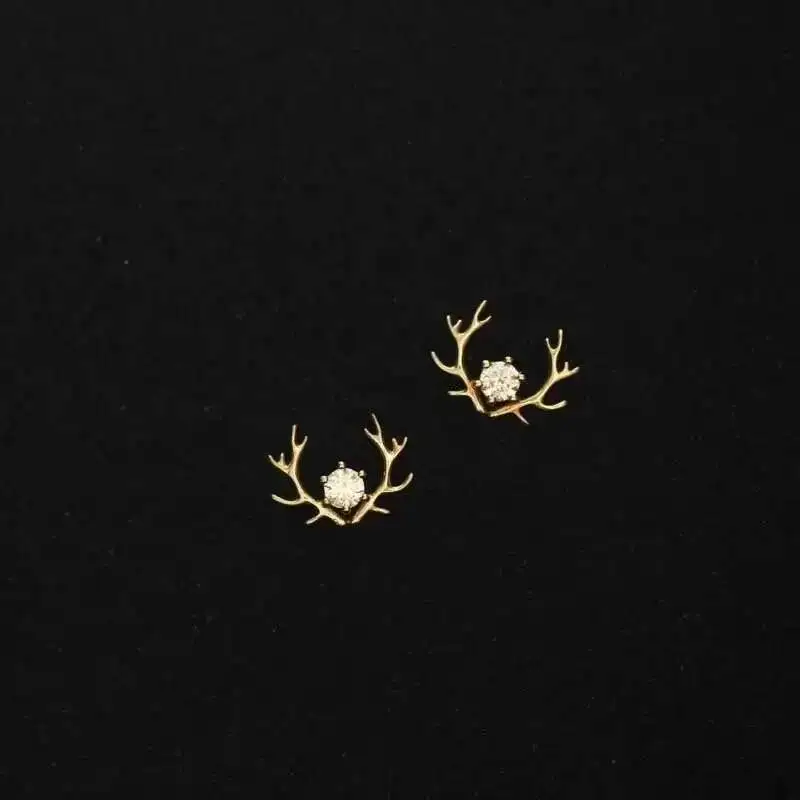9K Solid Gold Stud Earrings, Minimalist Hypoallergenic Deer Crystal Antlers Design, Trendy Simple Jewelry, kj98